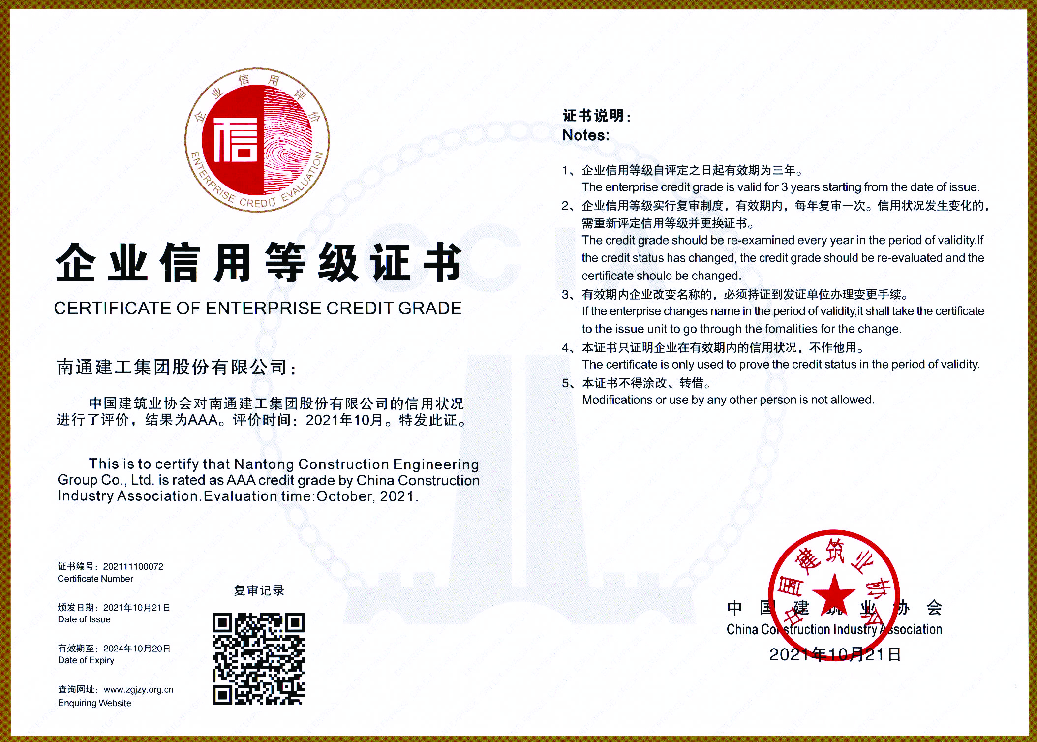 日前,由行业专家严格评审,经过社会公示及公告,中国建筑业协会印发了《关于公布2021年度建筑业AAA级信用企业的通知》,并授予了参评信用等级证书。集团公司正式荣获“2021年度全国建筑业AAA级信用企业”称号,这是全国建筑业企业信用等级评价最高级别。