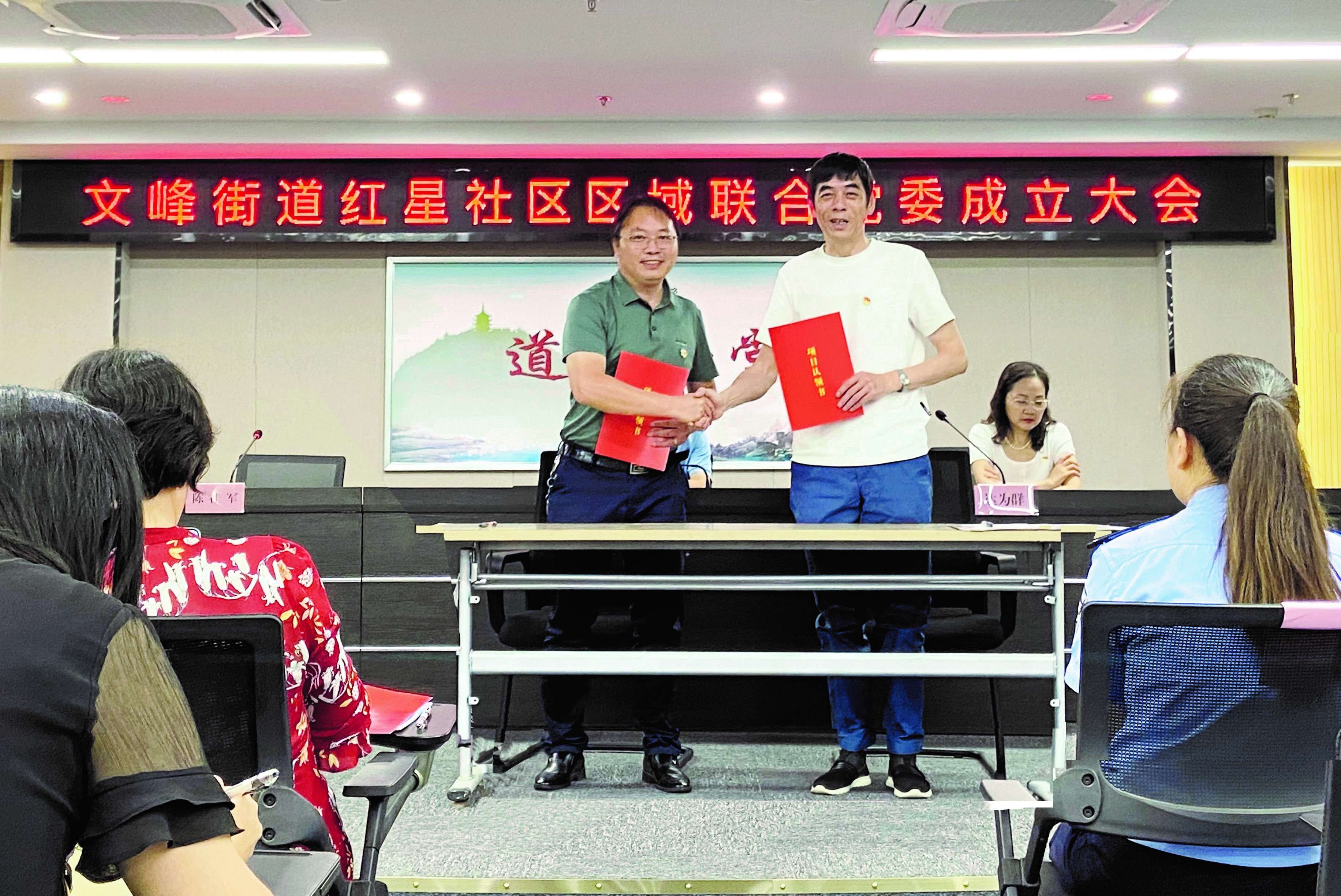 会上,陈桂军介绍了红星社区的基本情况及成立区域联合党委的目的和内容,吕晓春、达为群共同为“红星社区区域联合党委”揭牌。揭牌仪式后,社区党委与辖区各单位党支部本着“以共建促党建,以共建促发展”的原则,分别签订了共建协议,就党组织建设、党员队伍建设、党风廉政建设、业务合作等方面开展共建。吕晓春表示,社区党委与辖区各单位党组织签订共建协议,可以充分发挥社区党委的纽带作用,以区域化党建为引领,拉近企业、党员与群众的距离,实现联系常态化,有效进行彼此间资源、信息等方面的共享,建立和谐的良好关系,真正实现双向互动、联建共创的区域化党建工作新模式。